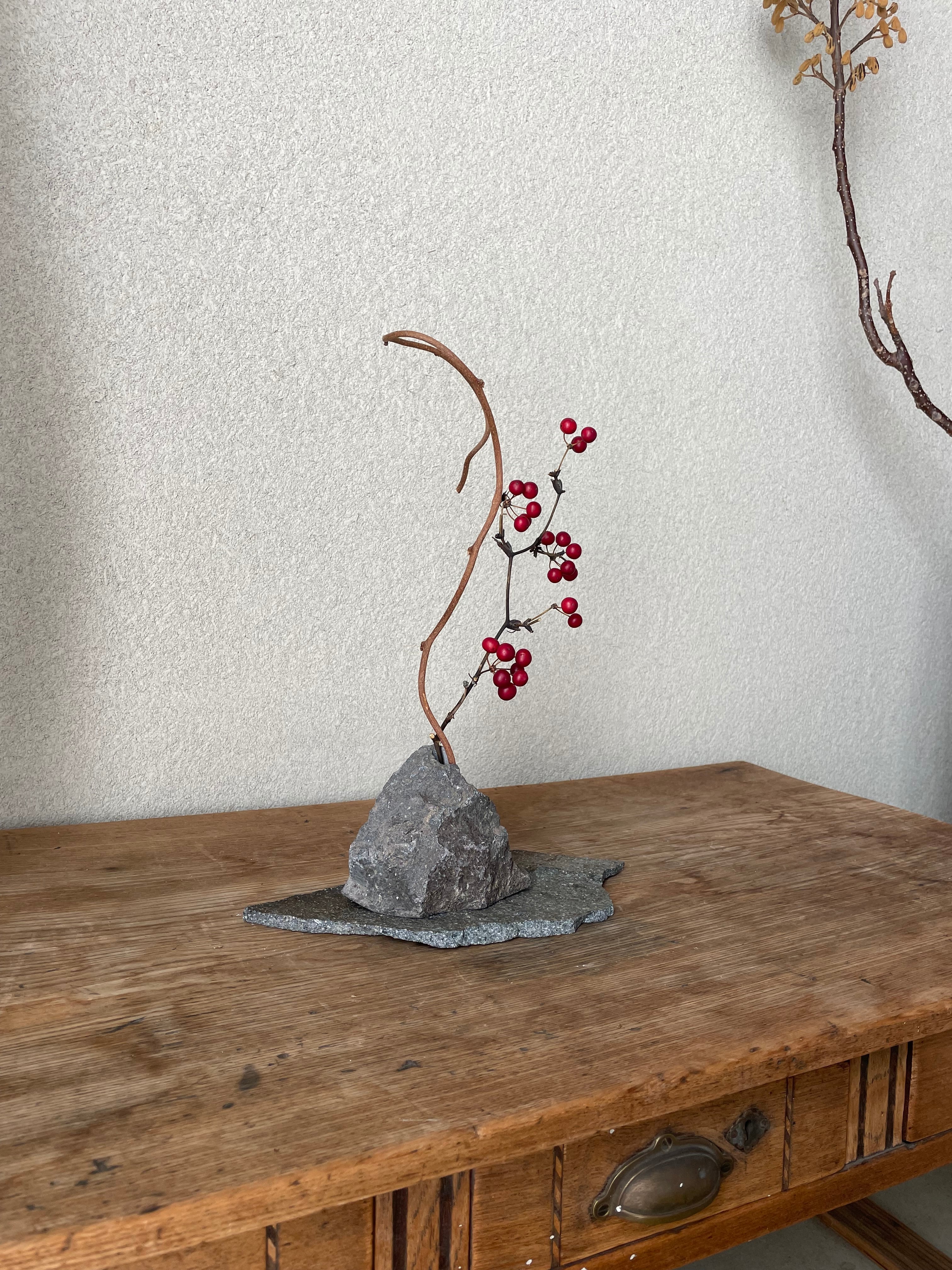 120 石の花器・石の敷台・枝ものセット