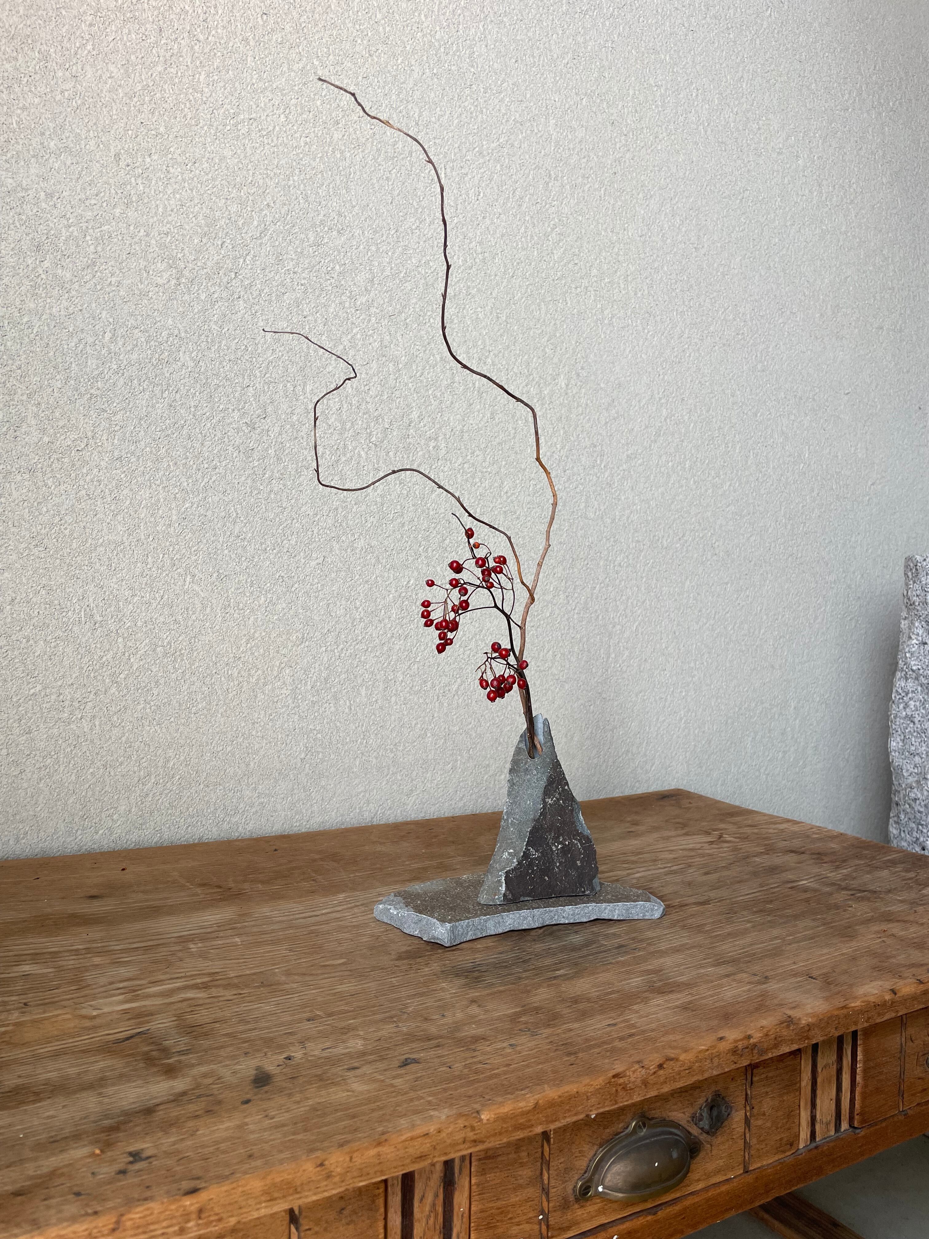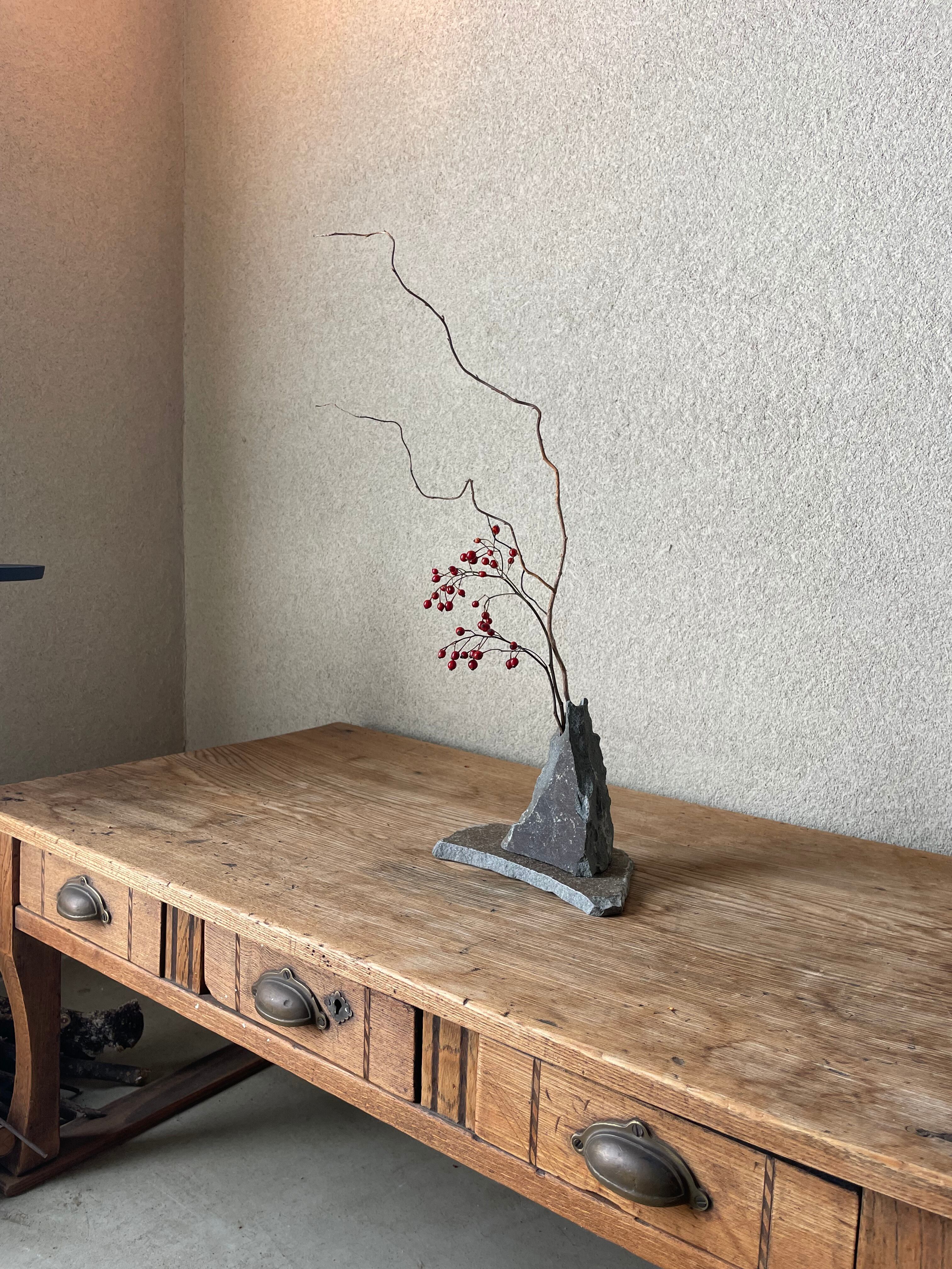 このセットは、花器に生けるだけでなく、石の敷台を使って自然素材の美しさをそのまま楽しむことができます。お好きな場所に飾ることで、日常に癒しの空間を作り上げることができるでしょう。